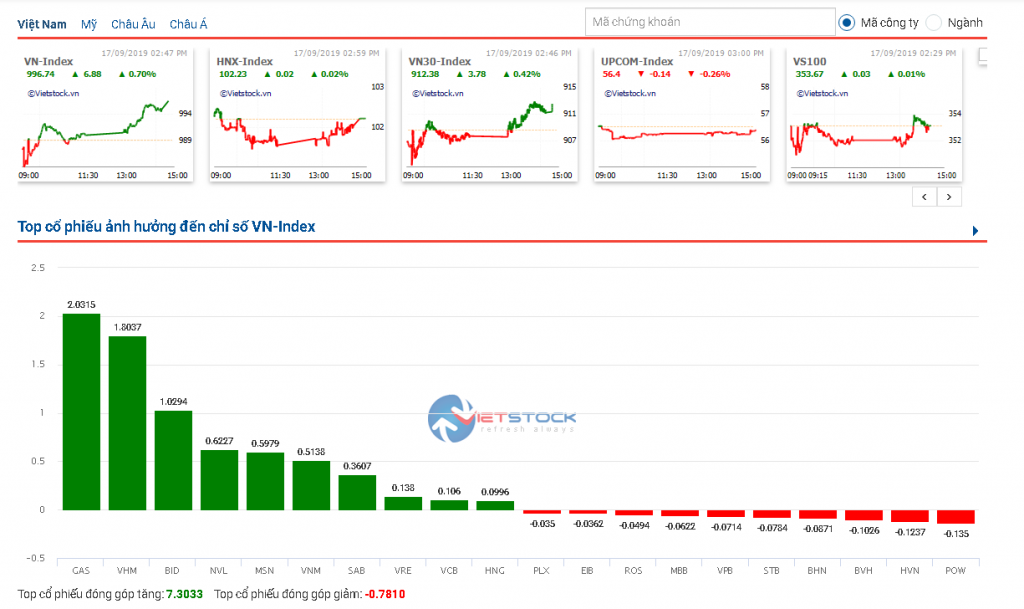 Chỉ số VN-Index đóng cửa 996.74, tăng 0.7% và tiệm cận ngưỡng 1,000 điểm là mức điểm cả năm nay thị trường đánh hoài không vượt qua nổi. Khối lượng giao dịch lớn hơn ngày hôm qua là dấu hiệu tích cực.