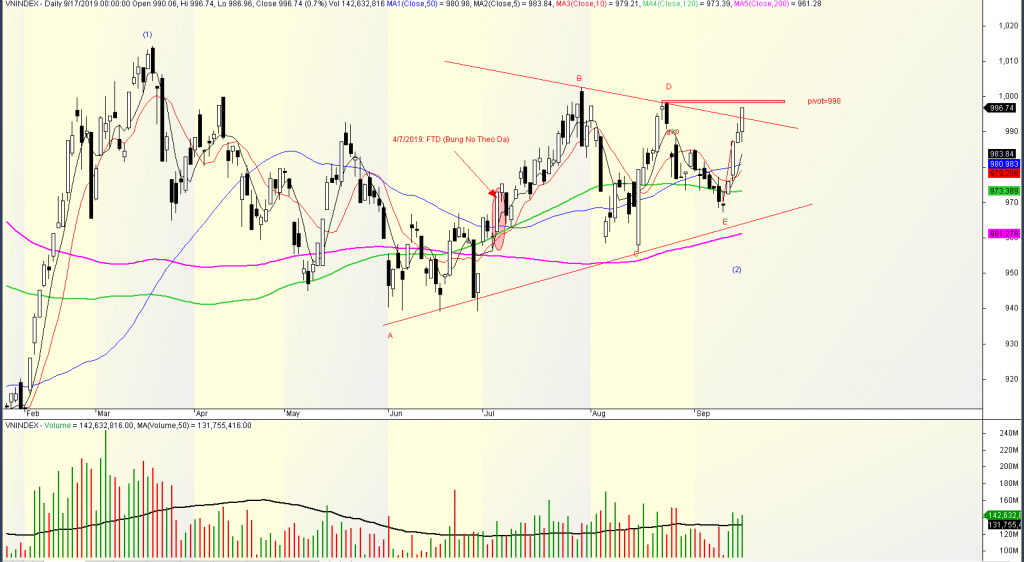 Chỉ số VN-INdex đang có mẫu hình tam giác (triangle) theo cấu trúc sóng Elliott và điểm pivot nằm ở 998 (đỉnh D).