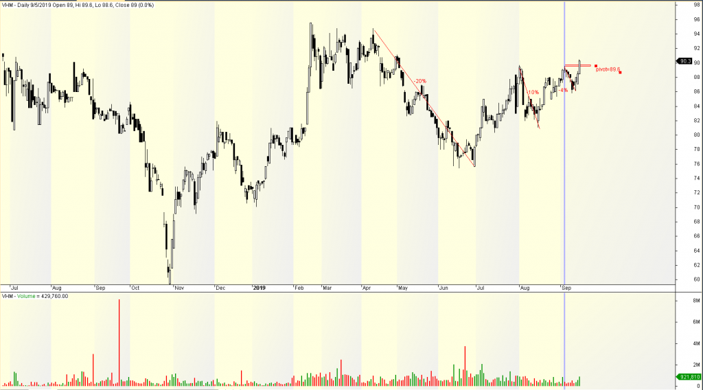 Cổ phiếu VHM hôm nay đã có điểm breakout của mô hình VCP sau 3 lần thu hẹp độ biến động (-20%; -10% và -4%). Khối lượng giao dịch tại điểm phá vỡ tăng 50% so với thanh khoản bình quân 50 phiên (đủ đạt chuẩn). Điểm pivot=89.6