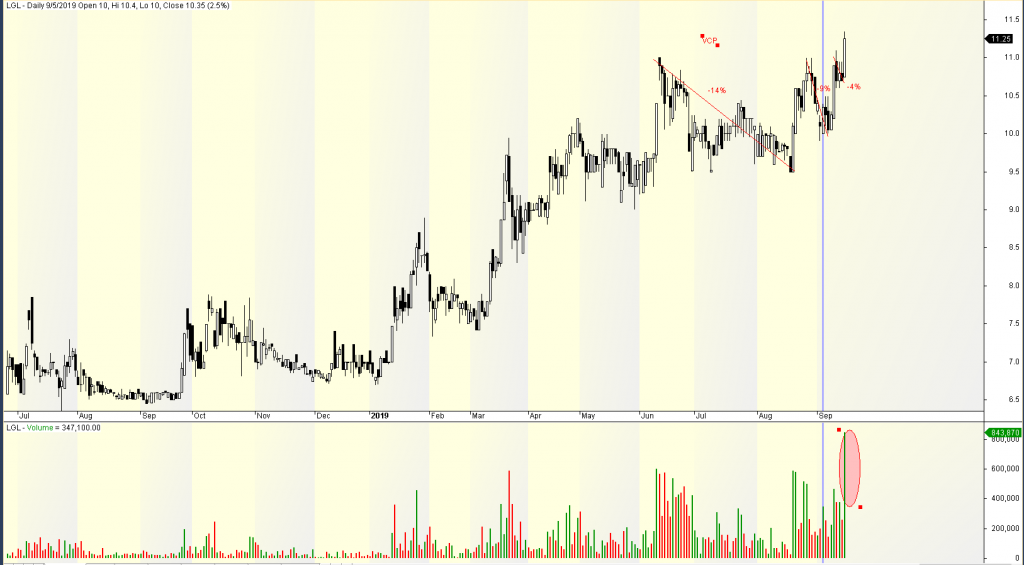 Cổ phiếu LGL cũng biến từ mẫu hình BO Trendline sang mẫu hình VCP và có điểm phá vỡ trong phiên giao dịch ngày hôm nay. (Xem lai khuyến nghị mua LGL: http://www.elibook.vn/2019/09/11/nhip-dap-thi-truong-11-9-2019-ho-viettel-bds-kcn-thep-bat-ngo-hoi-phuc-naf-tiep-tuc-tang-tran-tam-diem-lgl.html/ )