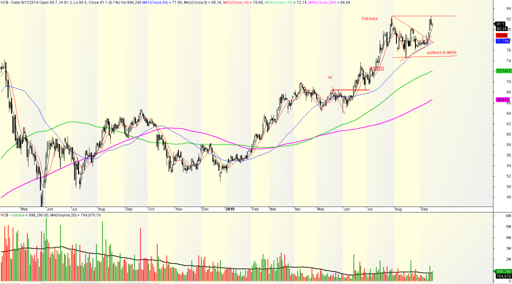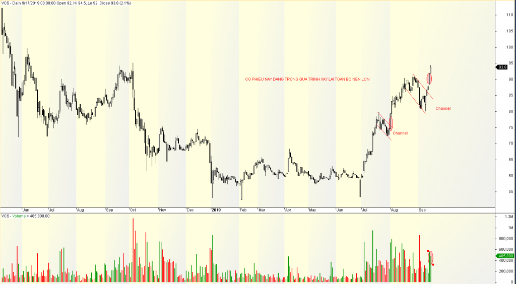 Cổ phiếu VCS đang trong quá trình xây dựng lại toàn bộ nền lớn bị gãy vào năm 2018. Do đó, cổ phiếu này hiện này đang ở vùng bên phải của nền, tăng giá bằng cách thiết lập các Channel (kênh giá). Hãy chú ý đến các cổ phiếu như thế này vì bạn có thể tìm kiếm nhiều điểm mua ở các cổ phiếu đạt chuẩn CANSLIM, ngay trong quá trình nó xây lại toàn bộ nền lớn.