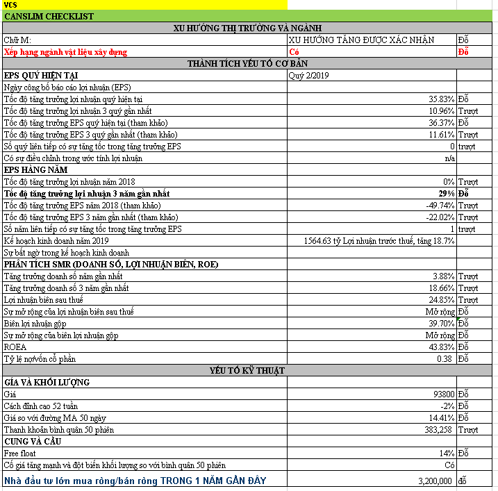 Bảng CANSLIM CHECKLIST của VCS cho thấy mã cổ phiếu này đang ĐỖ nhiều chỉ tiêu CANSLIM. Ngành vật liệu xây dựng đang có sóng ngành trong một xu hướng tăng của toàn thị trường.