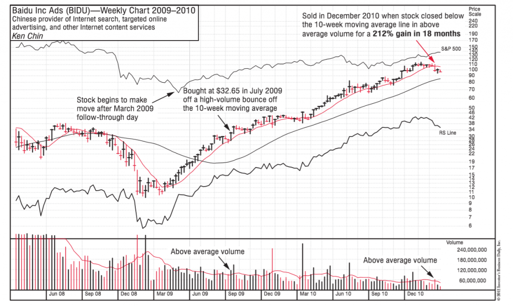 Sau đây là đồ thị của Baidu. Sau khi thị trường chung có ngày bùng nổ theo đà (follow Through Day) vào tháng 3/2009, Ken đã mua Baidu tại giá $32.65 vào tháng 7/2009 khi nó nảy lên đường trung bình di động 10 tuần (tương đương 50 ngày) với khối lượng giao dịch cao hơn mức trung bình. Đây là điểm breakout của mẫu hình chiếc cốc tay cầm. Ken đã trailing stop theo đường MA10 tuần (khi nó phá thủng với khối lượng giao dịch lớn) và chốt lãi với mức sinh lợi 212%.