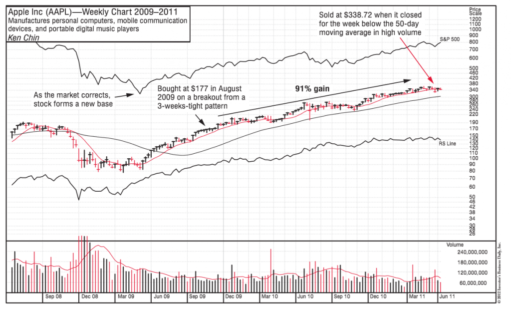 Tiếp theo là đồ thị của Apple khi có điểm breakout của mẫu hình giá đóng cửa thắt chặt trong 3 tuần. Ken mua tại giá $177 vào tháng 8/2009 và chốt lãi tại $338 khi nó đóng cửa dưới đường trung bình di động 10 tuần với khối lượng lớn.