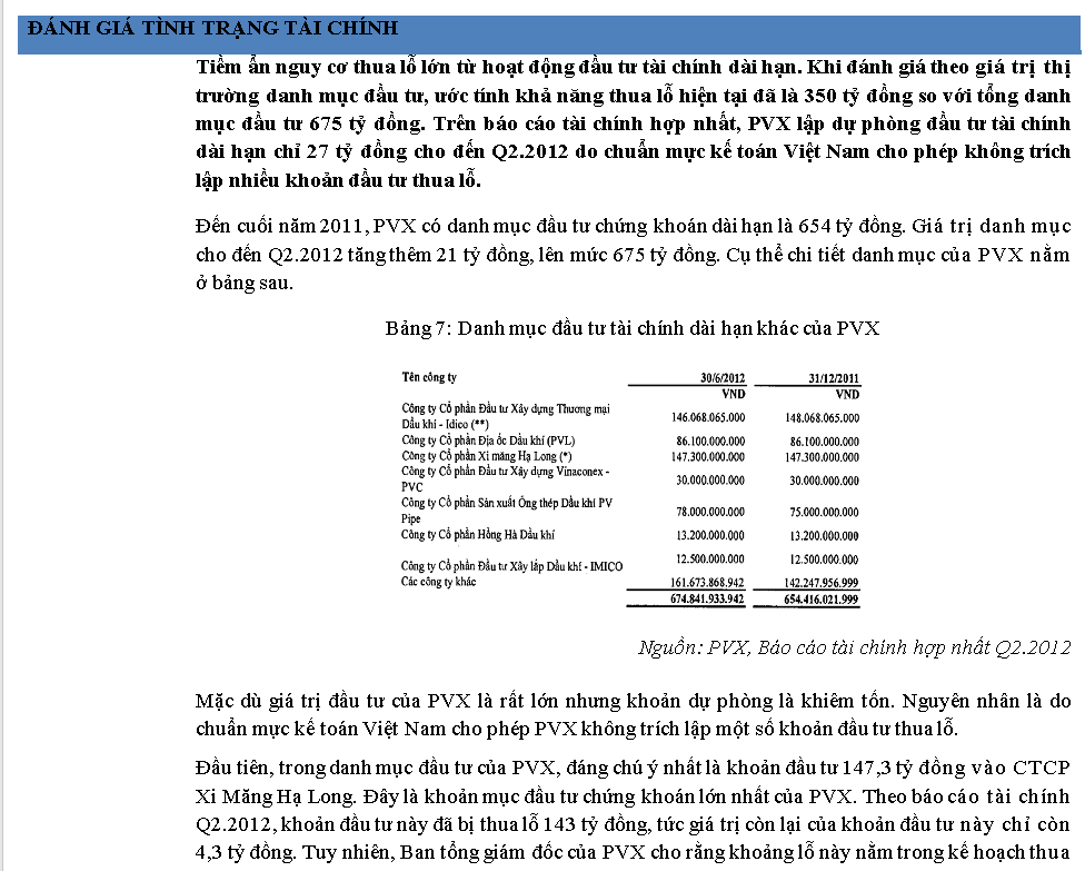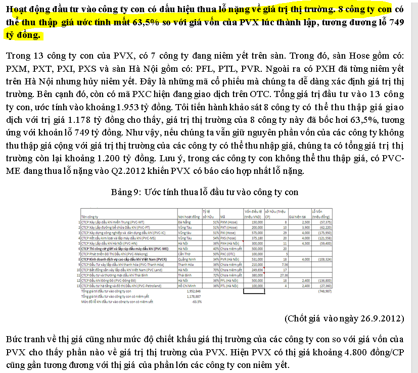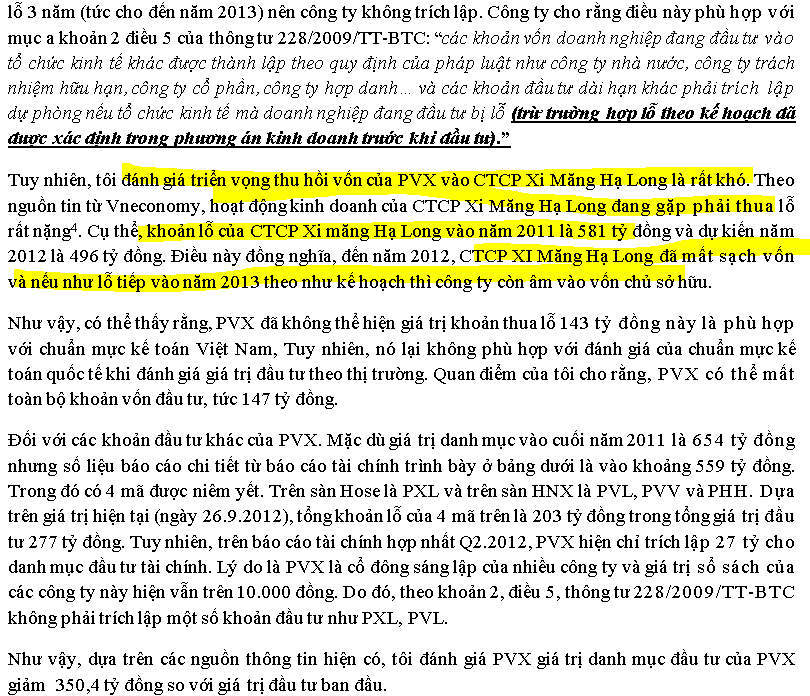 Thời điểm thực hiện báo cáo là vào tháng 9/2012. Tôi có quyền chọn lựa bất cứ mã cổ phiếu nào trong danh mục đầu tư của CTCK để phân tích. Sau bao nhiêu năm thì mới nhận ra, có lẽ “ngu nhất” là chọn phân tích những con hàng quá phức tạp như PVX. Lẽ ra nên chọn những mã đơn giản hơn, thời gian hoàn thành nhanh và đỡ đau đầu.