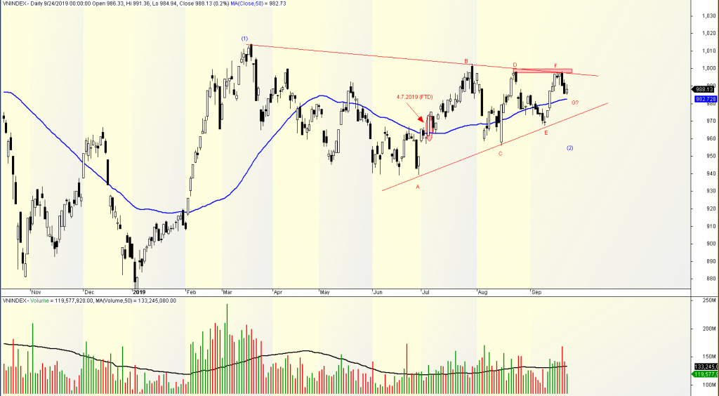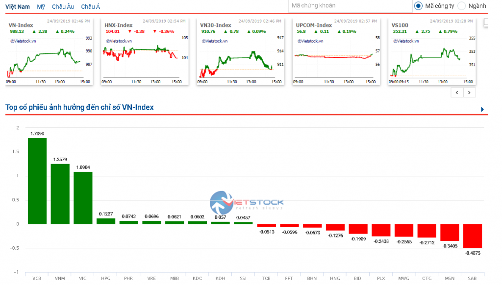 Kết phiên ngày 24/9/2019, chỉ số VN-Index tăng nhẹ 0.24% và đóng cửa ở mức 988.13. Thanh khoản thấp hơn phiên giao dịch hôm trước.