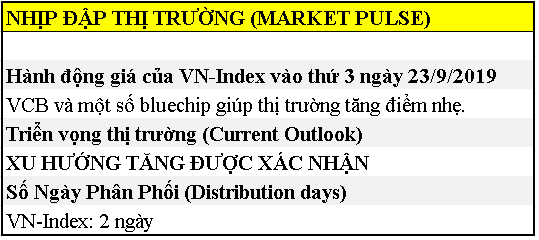 Hộp Nhịp Đập Thị Trường vẫn ghi dòng trạng thái: “XU HƯỚNG TĂNG ĐƯỢC XÁC NHẬN” với 2 ngày phân phối ở VN-Index.