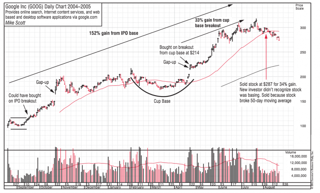 [Tiếp tục chuỗi series các câu chuyện đầu tư thành công bằng CANSLIM] Vào năm 2004, Mike Scott chỉ mới là một “cừu non (newbie)” khi bước vào thế giới đầu tư. Anh muốn sở hữu cổ phiếu Goole nhưng lúc đó anh ta không hiểu gì về các Nền Giá IPO (bạn có thể đọc cuốn sách của Phù Thủy Mark Minervini: “Giao Dịch Như Một Phù Thủy Chứng Khoán” để hiểu chi tiết hơn), vì thế đã bỏ lỡ điểm mua tại điểm breakout vào tháng 9/2004. Anh chỉ mua cổ phiếu Google khi nhìn thấy khoảng trống tăng giá vào tháng 4/200 (tại giá $214). Lực mua lớn khiến giá xuất hiện khoảng trống giá và thường xuất phát từ một báo cáo lợi nhuận tích cực hoặc thông tin tốt. Khoảng trống này là điểm phá vỡ của mô hình Chiếc cốc không có tay cầm (Cup Base).