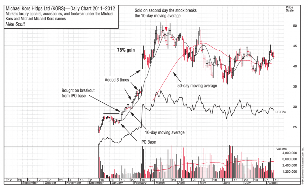 Mike đã rút kinh nghiệm từ sai lầm này và tạo ra một vài khoản lãi lớn từ các thương vụ IPO khác. “Tôi đã ra bài học quan trọng làm thế nào để mua các nền giá IPO từ thương vụ Google. Tôi đã không bỏ lỡ cơ hội ở Michael Kors khi nó IPO. Tôi mua cổ phiếu này vào ngày 17/1/2012 tại giá $27. Tôo đã làm bài tập về nhà và chờ đợi cổ phiếu này tăng giá, chạm vào điểm mua. Michael Kors được bảo trợ phát hành bởi ba tổ chức tài chính lớn, uy tín và có tăng trưởng doanh số, lợi nhuận ở mức ba con số. Công ty có sản phẩm được người tiêu dùng ưa chuộng. Vào ngày 17/1/2019, Michael Kors có khoảng trống tăng giá và tôi đã mua nó. Tôi tiến hành chốt lãi theo quy tắc 8 tuần, tức giá thủng MA10 ngày lần đầu tiên sau 8 tuần và thu về khoản lợi nhuận 84%. “