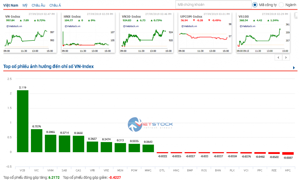 Vietcombank và họ nhà VIC giúp VN-Index tăng khá mạnh 0.72% và đóng cửa ở mức 997.84 điểm. Các cổ phiếu họ nhà Vincom như VIC, VHM, VRE đều tăng điểm. Thanh khoản tiếp tục tăng cao hơn phiên hôm trước là dấu hiệu tích cực.