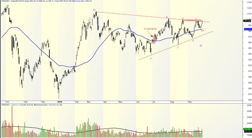 Mô hình sóng Elliott cho thấy VN-Index đã hoàn tất điểm G và sáng cửa vượt điểm E trong mô hình sóng tam giác.