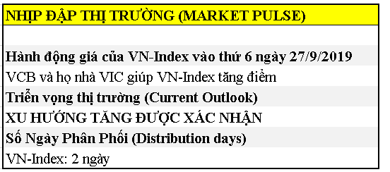 Hộp Nhịp Đập Thị Trường vẫn ghi dòng trạng thái: “XU HƯỚNG TĂNG ĐƯỢC XÁC NHẬN”. Lưu ý vào thứ 3 tuần tới, ngày phân phối 26/8/2019 sẽ bị loại bỏ ra khỏi số ngày phân phối khi thời gian 5 tuần trôi qua.