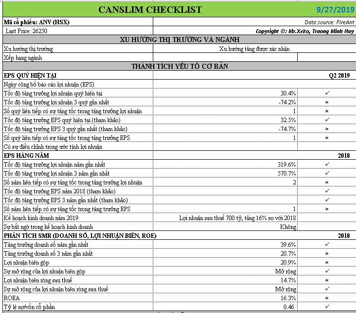 Tiêu điểm ngày hôm nay là cổ phiếu ANV. Đây là một cổ phiếu đạt chuẩn CANSLIM. Theo đó, tốc độ tăng trưởng năm 2018 là gấp 3 lần. Bình quân 3 năm gần nhất là 5.7 lần. Có 2 năm liên tiếp có sự tăng tốc trong tăng trưởng lợi nhuận. ROE tuy trượt chỉ tiêu nhưng tiến sát ngưỡng chuẩn 17%. Nợ/vốn cổ phần ở mức thấp. Biên lợi nhuận ròng ở mức 14.7% và đang mở rộng.