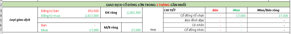 ĐIỀU QUAN TRỌNG LÀ CHÚNG TÔI ĐANG NHÌN THẤY LỰC MUA TỪ CỔ ĐÔNG LỚN. HIỆN TẠI TRONG 1 QUÝ GẦN NHẤT, CỔ ĐÔNG LỚN MUA VÀO 17,000 CỔ PHIẾU VÀ TRONG 3 QUÝ GẦN NHẤT LÀ 634,500 CỔ PHIẾU.