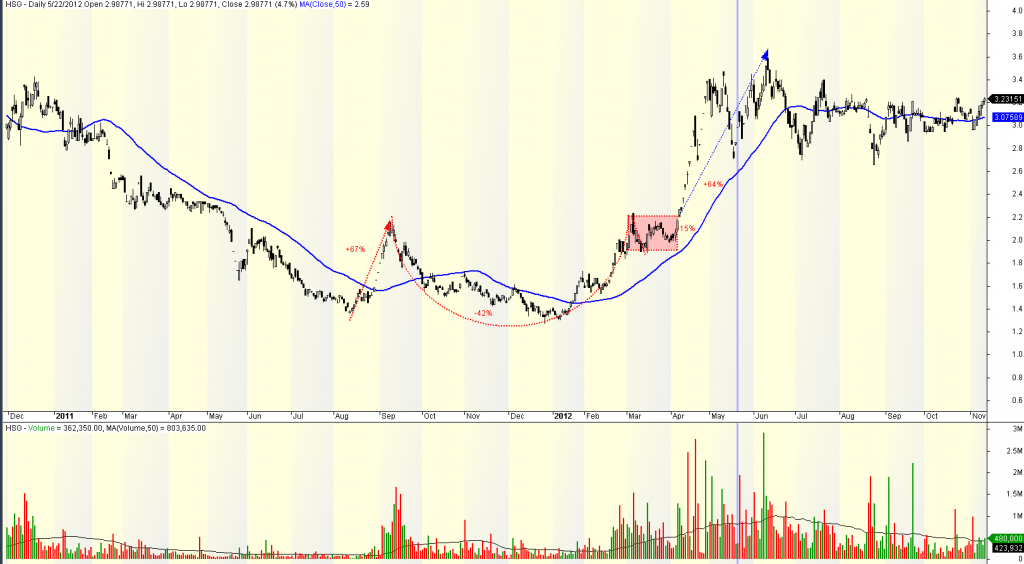 HSG của năm 2012 có đợt tăng giá gần 70% từ đáy tháng 8/2011. Sau đó, nó giảm sâu 42% và bắt đầu tạo đáy cho phần cốc. Tay cầm lỏng với độ sâu 15%. SO VỚI CÁC TIÊU CHÍ BÌNH THƯỜNG, ĐÂY LÀ MỘT MẪU HÌNH CHIẾC CỐC-TAY CẦM LỎNG. Nhưng nên nhớ, VN-Index đã giảm sâu 30% trong thời gian HSG hình thành mạn trái chiếc cốc (42%). Tỷ lệ 42%/30% là 1.4 lần, hoàn toàn nằm trong chuẩn cho phép. (lúc đó, vào năm 2012, tôi bỏ qua HSG vì nhìn thấy dấu hiệu bất thường này).