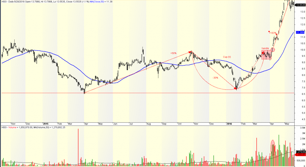 Lý do vì sức mạnh của mẫu hình chiếc Cốc-Tay cầm không nằm ở phần cốc mà ở tay cầm. Nếu tay cầm nhanh chóng siết chặt và breakout với volume lớn, mẫu hình vẫn chấp nhận được. HSG tăng 103% sau khi có điểm breakout vào tháng 4/2016.