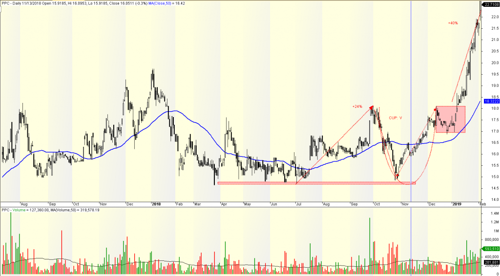 Nhưng may mắn, phần tay cầm của PPC lại siết chặt. Trong khi VN-Index tạo đáy mới vào tháng 12/2018, thì PPC đang siết phần tay cầm, với độ sâu chỉ 6%, khối lượng giao dịch thấp và nằm trên MA50 ngày. Điểm Breakout xuất hiện vào đầu tháng 1/2019 và PPC tăng 74% trong 7 tháng sau đó.