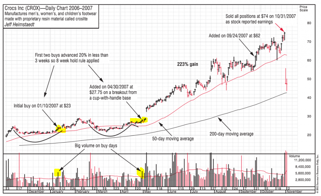 Jeff mua Crocs vào ngày 10/1/2007 tại mức giá $23 và ngày 30/4/2007 tại mức giá $27.75 khi có điểm phá vỡ mẫu hình chiếc cốc-tay cầm. Cả hai ngày xuất hiện điểm phá vỡ (breakout) đều có khối lượng lớn. Cả hai lần mua này đều có mức tăng giá trên 20% trong chưa đầy 3 tuần nên Jeff quyết định nắm giữ theo quy tắc 8 tuần. Cổ phiếu sau đó tăng 223% khi vẫn giữ được đường MA50 ngày. Vào ngày 24/9/2007, Jeff mua bổ sung vị thế tại giá $62 khi giá cổ phiếu bật dậy từ đường MA50 ngày.