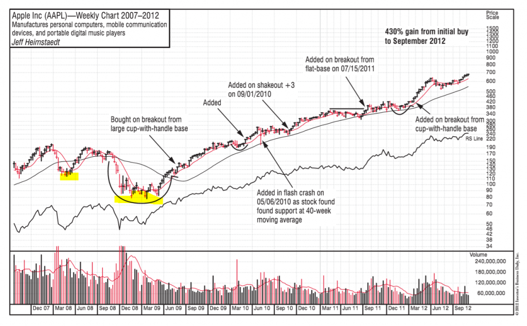Còn đây là siêu cổ phiếu Apple. Chiếc cốc có đáy hình thành sâu trong giai đoạn năm 2008-2009 bởi Khủng Hoảng. Đáy của chiếc cốc thấp hơn cả một số điểm khởi đầu cho xu hướng tăng trên 30% (xem điểm tôi tô vàng). Jeff mua tại điểm breakout mô hình chiếc cốc-tay cầm lớn này. Sau đó vào tháng 9/2010 tiếp tục mua bổ sung vị thế sau khi bật dậy khỏi đường MA50 ngày.