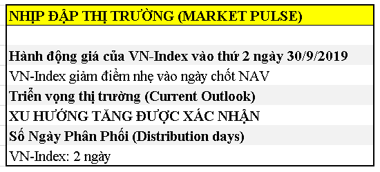 Hộp Nhịp Đập Thị Trường vẫn ghi dòng trạng thái: “Xu Hướng Tăng Được Xác Nhận” với 2 ngày phân phối ở VN-Index. Lưu ý vào ngày mai, ngày phân phối 26/8/2019 sẽ bị loại bỏ khi thời gian 5 tuần trôi qua.