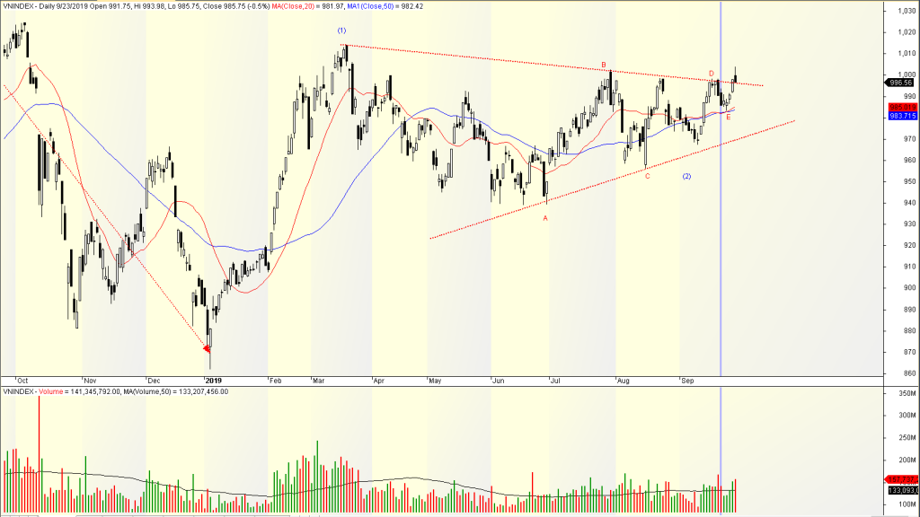 Tôi hiệu chỉnh một chút cách đếm nhãn mô hình sóng Elliott. Theo đó, điểm E đã hoàn tất và khả năng sóng (2) cũng sẽ hoàn tất. Chúng ta chờ đợi sự xác nhận khi vượt qua điểm D, tức mốc 1,000 điểm.