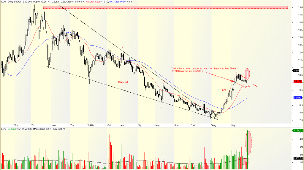 Tiêu điểm ngày hôm nay là LDG, cổ phiếu xuất hiện mẫu hình lá cờ (High Tight Flag). Cột cờ tăng 40% trong vòng 7 tuần sau đó lá cờ điều chỉnh nhẹ -4% trong hơn 2 tuần với khối lượng thấp. Ngày 30/9/2019, LDG có phiên breakout với khối lượng tăng đột biến.
