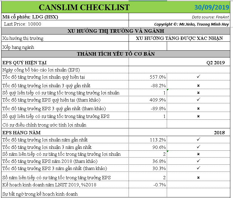 Bảng CANSLIM Checklist cho thấy LDG đỗ nhiều chỉ tiêu. Lợi nhuận năm 2018 tăng 113% và bình quân 3 năm gần nhất là 90%. Có 2 năm liên tiếp có sự tăng tốc của tăng trưởng lợi nhuận. Tăng trưởng lợi nhuận quý 2/2019 là 557% và tăng tốc so với quý 1.2019. ROE ở mức cao 19.6% và tỷ trọng nợ/vốn cổ phần thấp chỉ 0.47