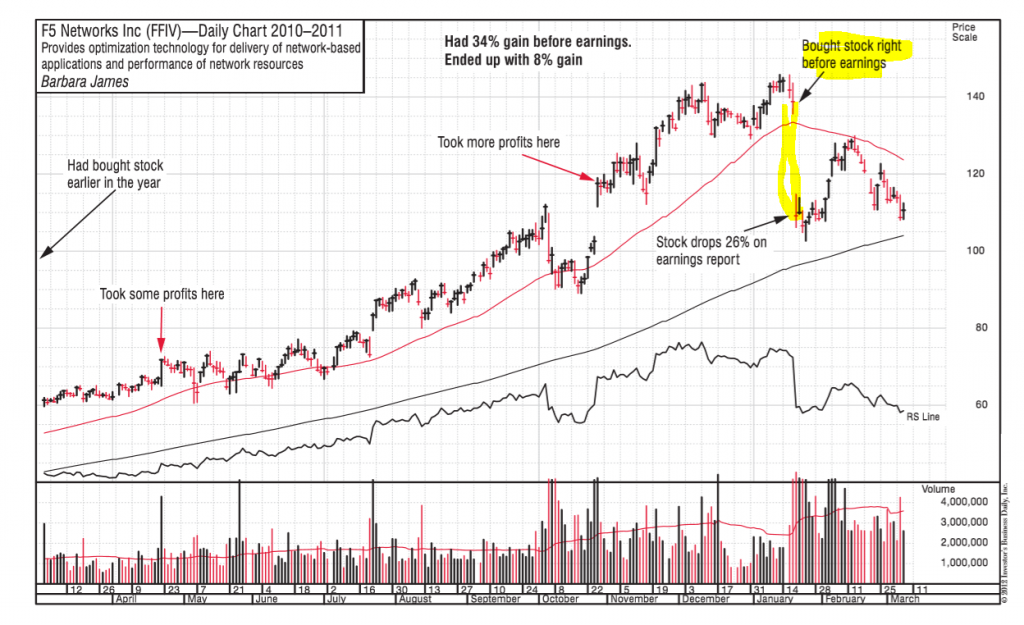 Vào năm 2009, Barbara thừa nhận rất thích cổ phiếu F5 Networks và đã mua cổ phiếu này ba lần. Vào tháng 4, cô ấy chốt lãi 12% và vào tháng 11, chốt lãi 22%. Nhưng lần thứ ba lại là cú “sập hầm”. Barbara phá vỡ quy tắc của mình khi mua cổ phiếu vào ngay trước ngày công ty công bố báo cáo lợi nhuận. Với lợi nhuận thấp hơn kỳ vọng, giá cổ phiếu ngay lập tức mở Gap Down 26%.