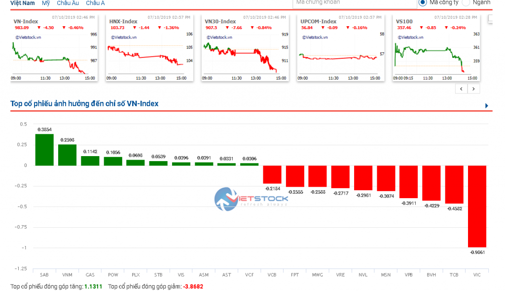 Kịch bản cũ lại tái diễn, càng về cuối phiên chiều, các Bluechip bị bán mạnh khiến VN-Index giảm điểm. Thủ phạm phiên nay là VIC, BVH, TCB. Chỉ số VN-Index giảm 0.46% trong khi chỉ số HNX-Index giảm 1.36%.