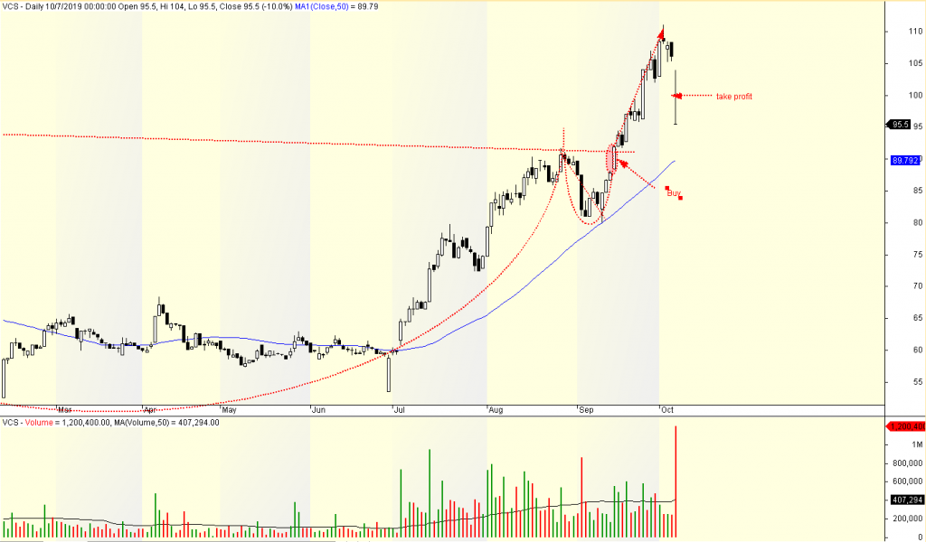VCS công bố báo cáo quý 3 (ngày 4/10/2019) cho thấy biên lợi nhuận ròng bị sụt giảm từ 29.4% ở quý 2/2019 xuống còn 23.8% ở quý 3/2019. Điều này khiến cho VCS bị bán sàn với khối lượng lớn. Chúng tôi đã vội vàng bán ngay sau 10h sáng để thu về một khoản lãi nhỏ ở VCS.