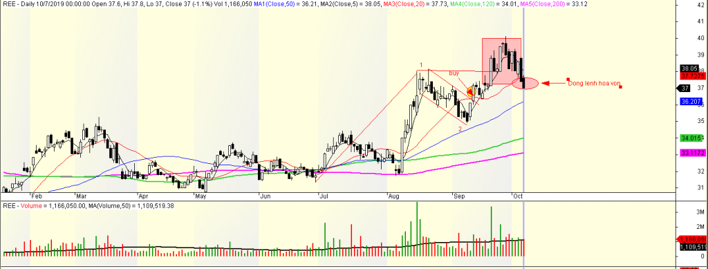 Chúng tôi cũng tiến hành “nhổ cỏ” REE bằng cách bán hòa vốn mã cổ phiếu này. REE đã giảm về đúng giá vốn mà chúng tôi đã mua vào nên theo nguyên tắc: “Không cho phép một khoản lãi biến thành khoản lỗ”, REE bị loại bỏ. Hơn nữa, phiên giao dịch ngày hôm nay xác nhận REE đã phá thủng MA20 ngày.