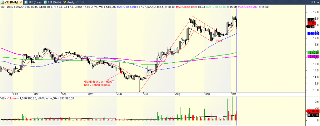VIB vẫn chưa công bố báo cáo tài chính quý 3 và phiên giao dịch ngày 7/10/2019 đang đóng cửa dưới MA10 ngày. Đối với các mẫu hình lá cờ, chúng tôi thực hiện trailing Stop để bảo vệ lợi nhuận theo MA10 ngày. Chúng tôi chờ sự xác nhận của phiên ngày mai để quyết định có nên “nhổ cỏ” cổ phiếu này hay không. Giá của VIB hiện đã về giá vốn mua vào của chúng tôi.