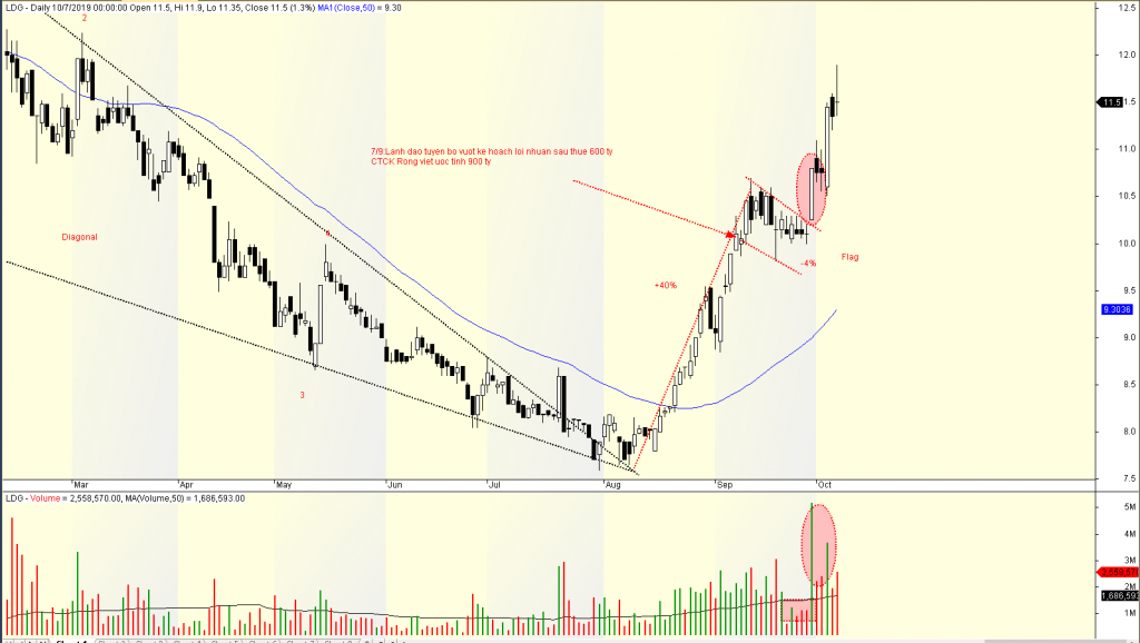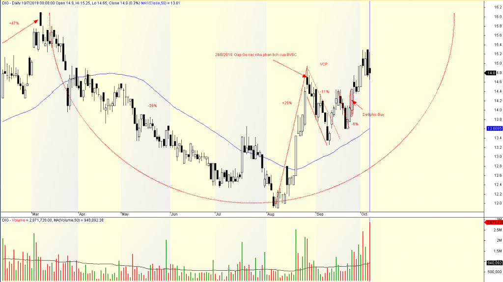 Tuy nhiên, DIG không giữ được đà tăng mạnh. Diễn biến xấu của thị trường chung khiến một số nhà đầu tư chốt lãi. Chúng tôi vẫn nắm giữ cổ phiếu này khi giá chưa thủng MA10 ngày hoặc MA20 ngày và triển vọng kinh doanh vẫn còn rất tích cực. Dự kiến doanh thu quý 4/2019 sẽ là 1,200 tỷ, tức gấp 3 lần quý 3/2019