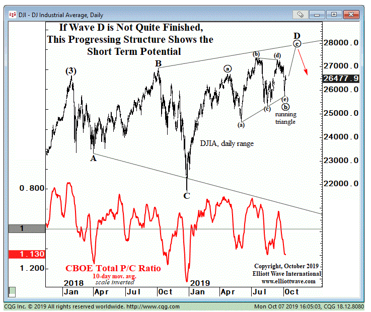 Nếu sóng D chưa hoàn tất, khả năng chỉ số Dow Jones sẽ còn vươn lên mức 28,000. Tôi đang nhìn thấy dạng sóng Running Triangle ở vị trí sóng b (vòng tròn). Như vậy, còn có khả năng tăng giá theo sóng c(vòng tròn)