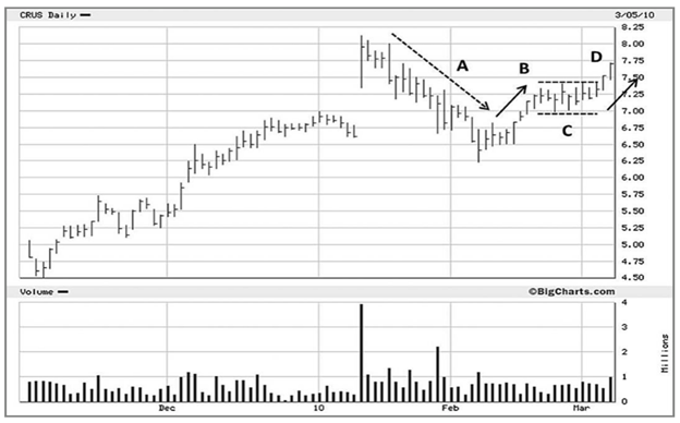 Hình 7-11 Cổ phiếu Cirrus Logic (mã CRUS) năm 2010. Tăng 162% trong 4 tháng sau khi hình thành mẫu hình 3-C.