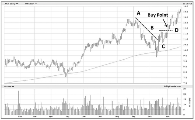 Hình 7-12 Cổ phiếu JetBlue Air (mã JBLU) năm 2014. Cổ phiếu này xuất hiện mẫu hình 3-C (tại điểm D) và sau đó tăng 130% trong 11 tháng.