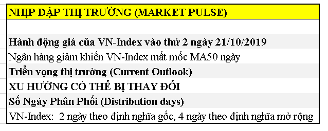 Việc chỉ số VN-Index mất mốc MA50 ngày khiến triển vọng thị trường bị bật sang chế độ đèn vàng. “XU HƯỚNG TĂNG CÓ THỂ BỊ THAY ĐỔI“.Theo định nghĩa gốc của O’Neil, VN-Index có 2 ngày phân phối là 2/10 và 21/10. Tuy nhiên, ngày 30/9 và 14/10/2019 có thể được xem là ngày phân phối theo nghĩa rộng: “Khối lượng lớn nhưng giá không tăng nhiều”.