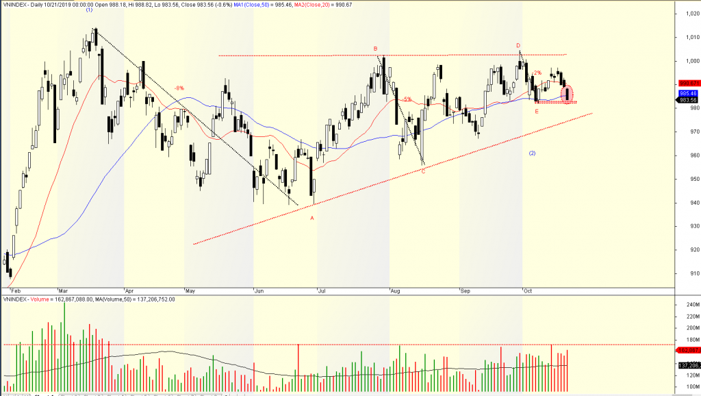 Nếu ngày mai, VN-Index tiếp tục lủng đáy E và đóng cửa dưới đường MA50 ngày, triển vọng thị trường sẽ trở nên kém đi rất nhiều. Khả năng đáy E chưa hoàn tất mà lại tiếp tục xây.