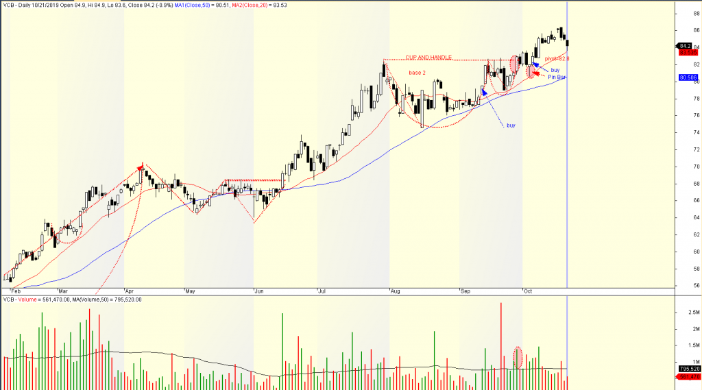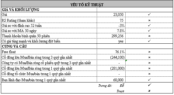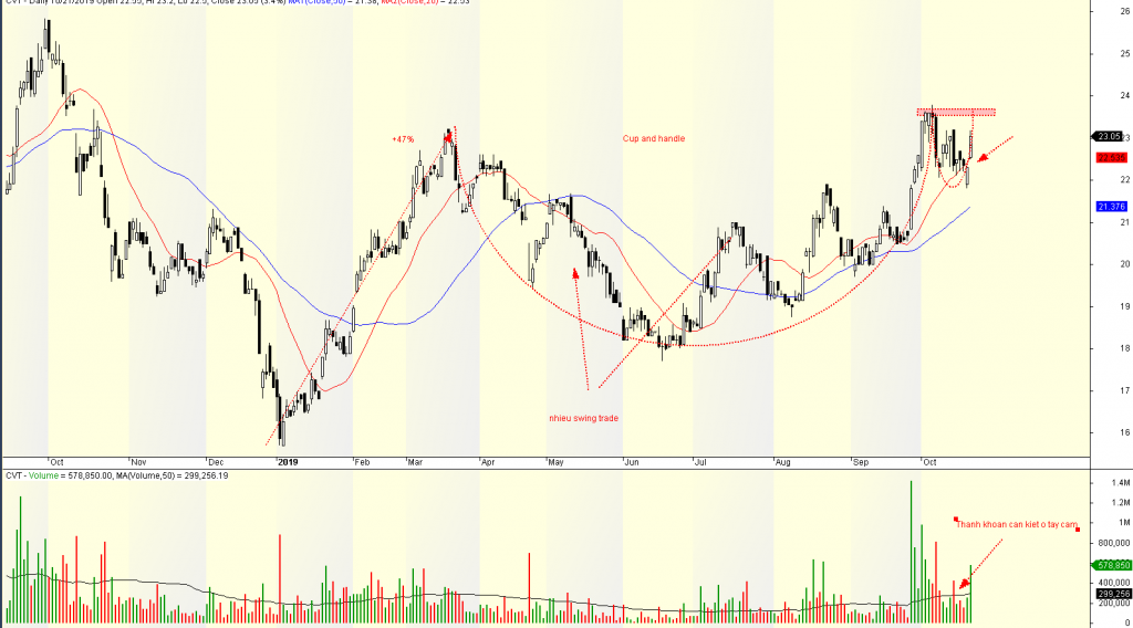Yếu tố kỹ thuật có cổ đông lớn bán ròng trong 3 quý (hơn 244,000 cổ phiếu). Sức mạnh giá (RS) của cổ phiếu này cũng chỉ ở mức 75 và cơ cấu cổ phiếu loãng (free float lên tới 76%). CVT đang hình thành mẫu hình Chiếc Cốc-Tay Cầm với tay cầm đang có thanh khoản giảm dần. Tuy nhiên, phần chiếc cốc có khá nhiều dao động Swing nên khiến nền giá này chưa thật sực vững chắc. Tay cầm cần siết chặt hơn. DO ĐÓ, CHÚNG TÔI TẠM ĐỂ CVT vào danh mục theo dõi.