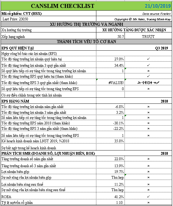 Tiêu điểm ngày hôm nay là CVT nhưng chúng tôi chưa thực sự ấn tượng về mã cổ phiếu này VÀ KHÔNG ĐƯA NÓ VÀO DANH MỤC ĐẦU TƯ TĂNG TRƯỞNG. Tăng trưởng lợi nhuận sau thuế Q3/2019 là 27% đi kèm với bình quân 3 quý là 34.4%, CVT đang thỏa mãn tiêu chí chữ C. Biên lợi nhuận quý 3 là 17.5%, tăng nhẹ so với quý trước là 15.1% nhưng vẫn còn thấp so với mức trên 20% của cuối quý 4/2018.