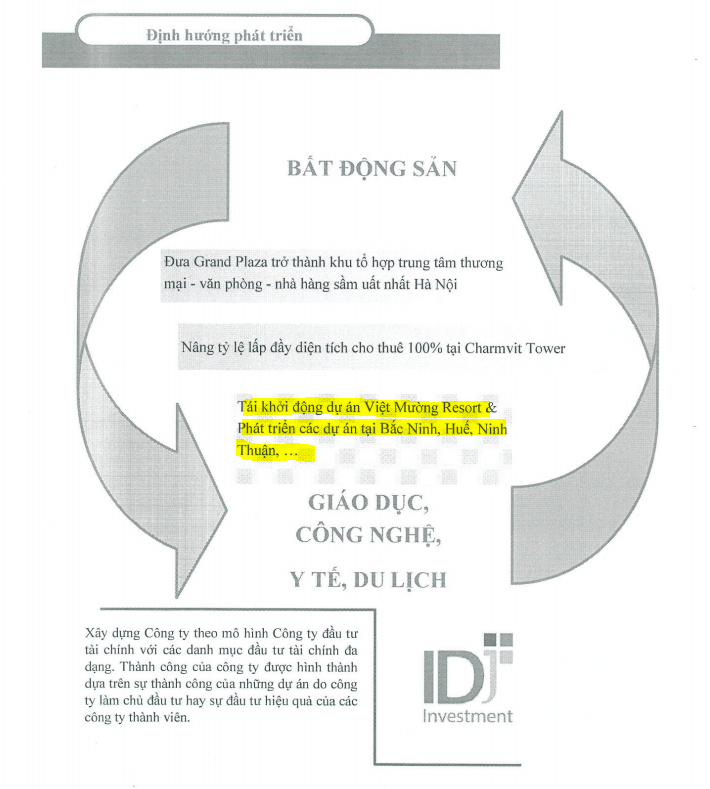 IDJ có 1 công ty con và 4 công ty liên kết. Hoạt động kinh doanh chính của IDJ là cho thuê văn phòng thương mại (Tòa Nhà Charmvit). Đây là tòa nhà hạng A tọa lạc tại ngã tư Trần Duy Hưng-Hoàng Minh Giám, Hà Nội. Công ty cũng cho thuê tổ hợp gồm Trung tâm thương mại (Grand Plaza), văn phòng (thời gian 50 năm) và tầng hầm (3-5 năm). Tỷ lệ lấp đầy là 91%. Hai mảng kinh doanh này được quản lý bởi công ty liên kết là: