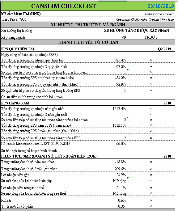 Lợi nhuận quý 2/2019 của IDJ sụt giảm 85% so với cùng kỳ năm ngoái do sự sụt giảm của mảng Hợp Đồng Xây Dựng và kinh doanh bất động sản. Theo lý giải của công ty là do công ty tập trung cho việc đấu giá dự án 5,5ha khu đất nhà máy xi măng Lạng Sơn cũ trong khi các dự án cũ đang trong giai đoạn triển khai chưa hạch toán doanh thu (không đáng ngại vì khoản mục người mua trả tiền trước và phải trả dài hạn tăng lên).. Do đó, tạm thời IDJ chưa đáp ứng chữ C