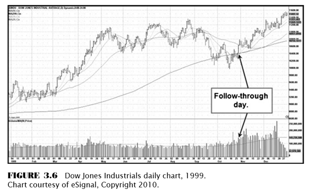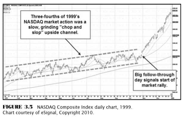 Khi nghe nói về “thị trường bong bóng dot-com” của năm 1999, có thể bạn chỉ biết đây là buổi tiệc lớn, kéo dài trong nhiều năm của các nhà đầu tư chứng khoán. Đó vẫn chưa phải là sự thực. Như Hình 3.5 cho thấy, 9 tháng đầu tiên của năm 1999, chỉ số Nasdaq biến động khó lường (choppy market) và thiết lập các đỉnh cao mới một cách chậm chạp, cú tăng tốc chỉ đến vào đầu tháng 10 năm 1999. Trong suốt phần lớn các tháng khó khăn của năm 1999, chỉ số Nasdaq thiết lập đỉnh cao mới, sau đó lại quay đầu giảm. Rất khó để bạn kiếm tiền trong giai đoạn này, cứ mỗi lần cổ phiếu bắt đầu tăng nhanh được một chút thì nó lại có cú rũ bỏ. Vào giữa tháng 10 năm 1999, thị trường trông chẳng có vẻ gì là hứa hẹn cả.