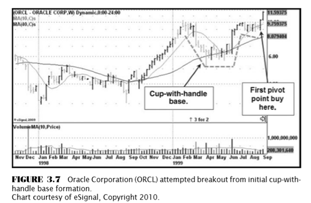 Chắc chắn, đến ngày 28 tháng 10, chỉ bảy ngày sau khi chúng tôi nghĩ rằng các chứng khoán vốn hóa lớn sẽ sụp đổ, thì chỉ số thị trường có một ngày bùng nổ theo đà cực mạnh, là tín hiệu cho thấy thị trường chung bắt đầu xu hướng tăng giá mới. Thế đấy, bất cứ khi nào chúng ta nghĩ thị trường cắm đầu thì ngay lập tức nó lại tăng giá. Không có nếu như, và hoặc nhưng. Thị trường đã đưa ra lời phán quyết bằng ngày bùng nổ theo đà, và khi thị trường tăng giá trở lại, chúng tôi cũng thay đổi quan điểm của mình. Tất nhiên, đúng lúc đó, chúng tôi chẳng hề nghĩ đây là con sóng tăng giá vĩ đại nhất trong sự nghiệp của mình, một cú tăng giá như tên lửa mà hình 3.5 đã minh họa. Danh sách mua của tôi đã mở rộng từ vài tuần trước, và tôi đã sẵn sàng hành động. Một trong những cổ phiếu tôi đang quan sát là Oracle Corp (mã ORCL), đã xuất hiện điểm phá vỡ từ mẫu hình chiếc cốc-tay cầm vào tháng 9 năm 1999, trước khá lâu so với ngày bùng nổ theo vào cuối tháng 10 (xem Hình 3.7). Lưu ý trong tất cả đồ thị này, giá của ORCL đều được điều chỉnh sau chia tách, vì thế giá $10 ngày mà tôi đang sử dụng ngày hôm nay thực ra là giá $40 vào năm 1999, trước khi có chia tách