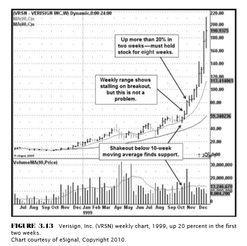 Verisign tăng giá rất nhanh, giống hệt như Oracle, tức tăng 20% chỉ trong 1-2 tuần đầu tiên sau khi thiết lập điểm phá vỡ từ nền giá vào cuối tháng 10. Điều này khiến tôi nhớ đến quy tắc cơ bản được dạy bởi William O’Neil rằng: “nếu bạn mua cổ phiếu thiết lập điểm phá vỡ vượt lên trên điểm pivot và tăng 20% trong thời gian chưa tới 3 tuần, thì khả năng bạn nên nắm giữ trong 8 tuần (tính từ điểm phá vỡ)”. Quy tắc này giúp tôi nắm giữ Verisign trong suốt thời gian còn lại của năm