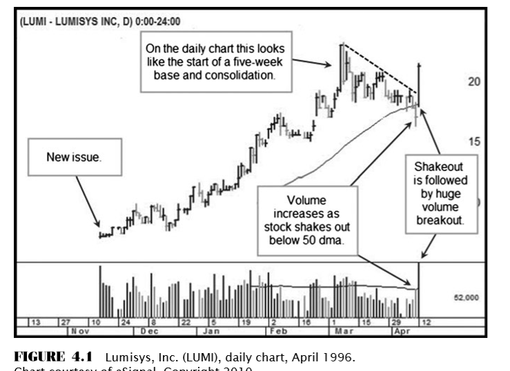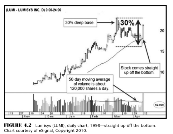 Khi Lymisys bắt đầu IPO vào tháng 11 năm 1995, tôi đang rất bận rộng với C-Cubem vì thế dễ dàng duy trì kỹ luật và chờ đợi cho Lumisys hình thành nền giá đầu tiên. Điều này không xảy ra trong suốt tháng 4 năm 1996 và sau khi tôi đã chốt lãi C-Cube được vài tháng và có một vài ý tưởng đầu tư nhưng không hoạt động tốt. Vào năm 1996, tôi chủ yếu sử dụng dịch vụ Daily Graphs của Nhật Báo IBD, vì thế gần như tập trung quan quan sát đồ thị ngày. Hình 4.1 cho thấy đồ thị ngày của Lumisys vào tháng 4 năm 1996 khi nó vừa có điểm phá vỡ thoát ra khỏi nền giá hình thành trong 5 tuần, và vì tôi đã yêu thích sản phẩm của công ty này, tôi cảm thấy phải mua nó khi nhìn thấy điểm phá vỡ hoàn hảo với khối lượng lớn. Tuy nhiên, nó không hề hoàn hảo như tôi nghĩ!