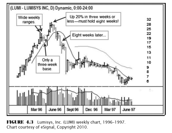 Một khi Lumisys đã có điểm phá vỡ, giá tăng 20% chỉ trong 3 tuần, điều đó khiến tôi liên tưởng tới “quy tắc 8 tuần” trong đó cổ phiếu nên càng tin rằng phải nắm giữ ít nhất trong 8 tuần. Như bạn thấy trong Hình 4.3, việc ôm cổ phiếu theo tắc 8 tuần đã dẫn tới sự thất bại nặng nề khi cổ phiếu giảm xuống dưới điểm phá vỡ và quay trở lại mức giá IPO.