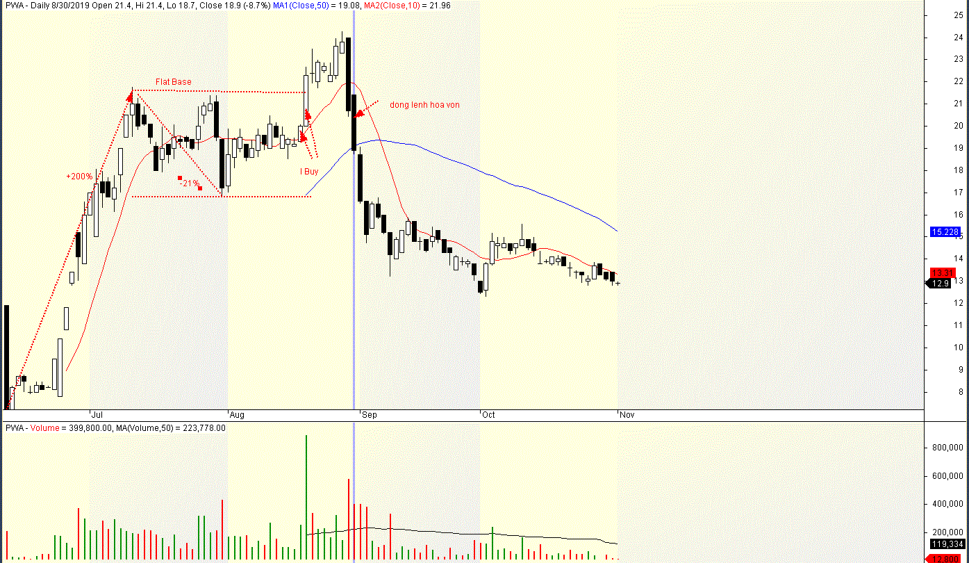 Trong quá trình phân tích hậu giao dịch cho tháng 8, tôi đã nhìn lại sai lầm của mình ở PWA. PWA có cú tăng tốc gần 200% sau khi niêm yết, trong bối cảnh dòng cổ phiếu bất động sản khu công nghiệp đang lên cơn sốt. Tôi đã đánh giá sai Nền Giá Đầu Tiên của PWA. Thời gian hình thành nền giá là khoảng 5-6 tuần hơn. Với tôi đây vẫn là khoảng thời gian còn quá ngắn ở nền giá đầu tiên. Nền giá đầu tiên nên hình thành càng lâu càng tốt.