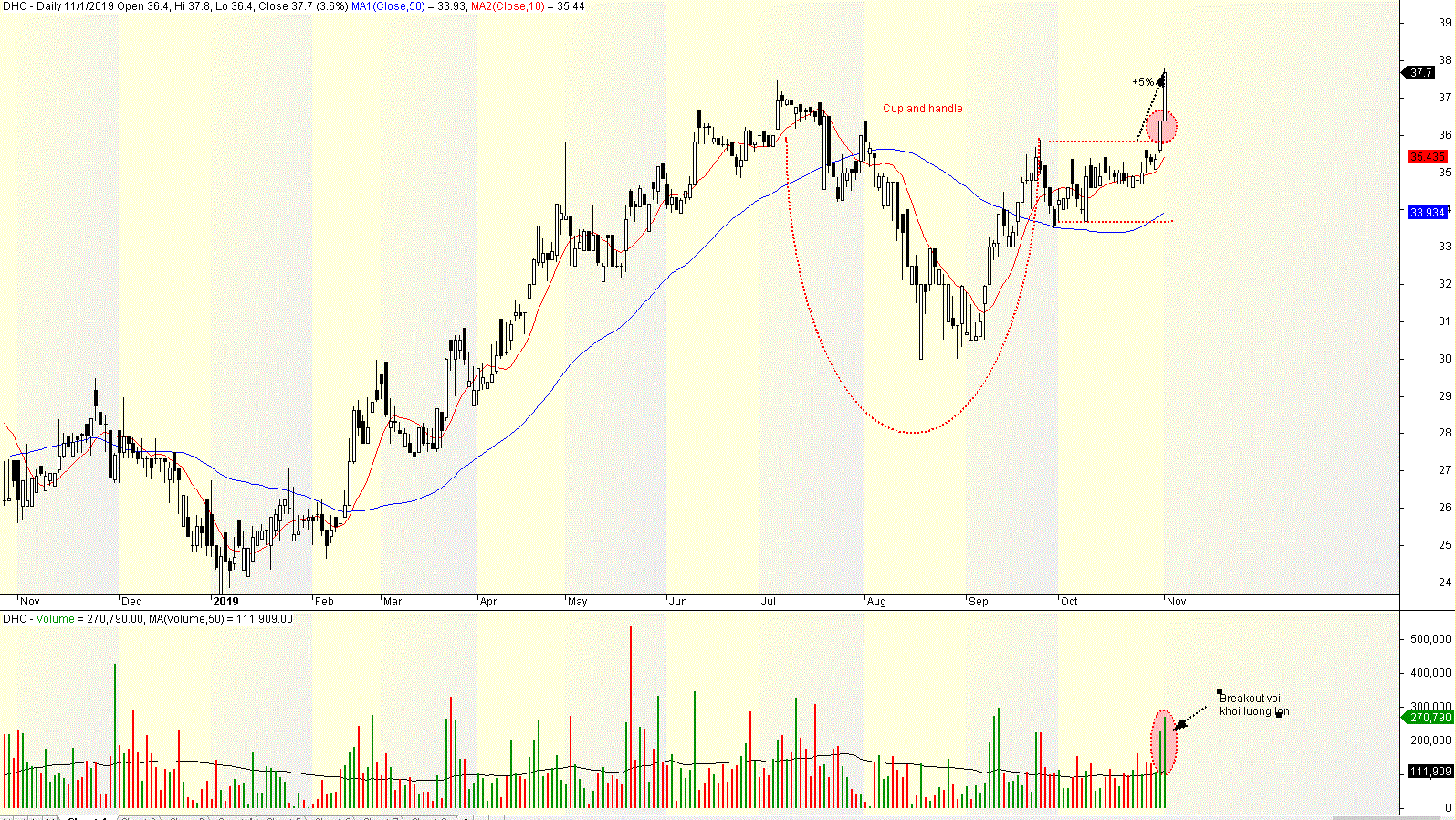 Cổ phiếu DHC có điểm breakout từ mẫu hình chiếc cốc tay cầm. Điểm pivot=35.8. Stoploss nên đặt 5% dưới giá mua. Đây là nền giá số 2