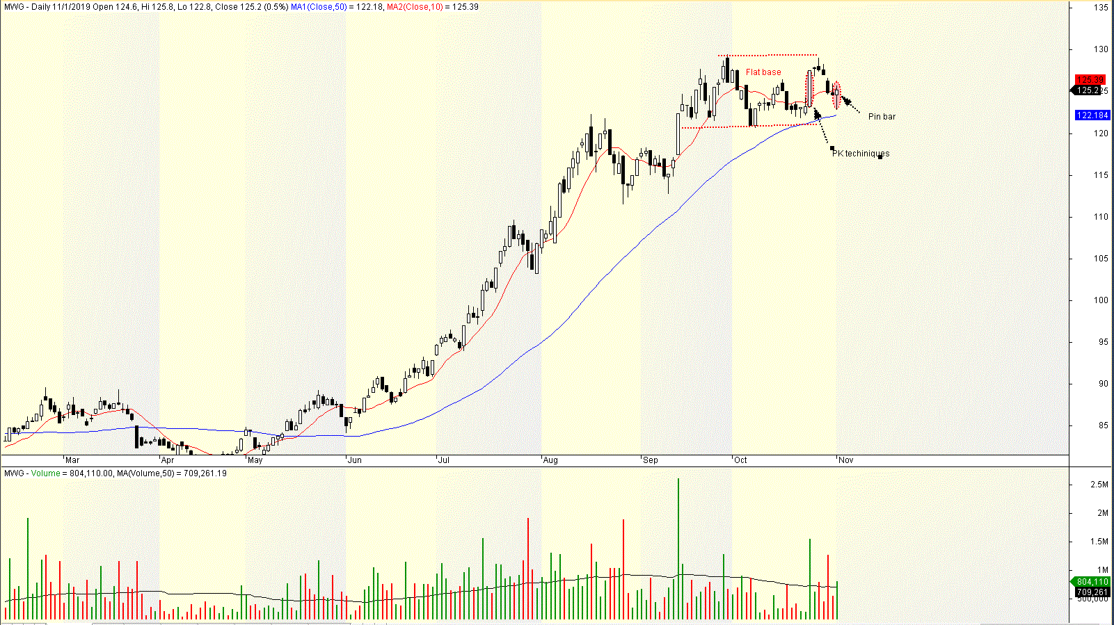 Cổ phiếu MWG xuất hiện cây Pin Bar vào phiên ngày 1/11/2019. Trước đó, MWG đã có điểm mua sớm theo kỷ thuật PK Techiniques, một kỹ thuật riêng của học viên khóa Trend Trader.  MWG hình thành Nền Giá Phẳng (Flat base) với độ sâu gần -7% và thời gian hình thành 5 tuần. Đây là nền giá số 2